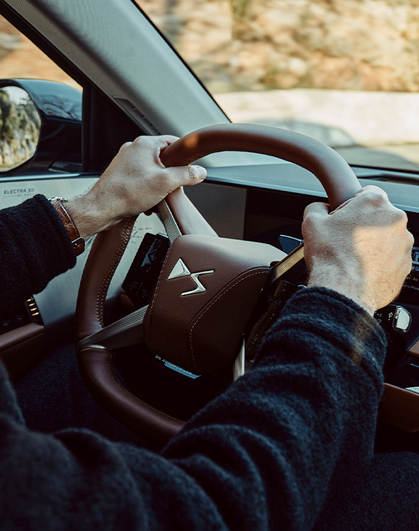 DS Neck Warmer difunde una capa de calor suave alrededor del cuello de los pasajeros delanteros. La activación y el ajuste están disponibles directamente en la pantalla central. Las funciones de volante y asientos calefactables completan el confort térmico cercano, preservando la batería.